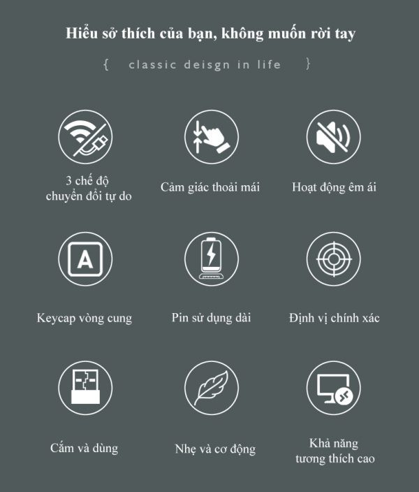 - Kết nối : Bluetooth 5.0, BT3.0 , Wireless 2.4Ghz và Wired USB-A To C (sạc)