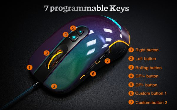 Chuột HI-END Newmen GX6 Pro Charmaleon tiếp tục được phát triển từ kiểu dáng chuột bắn súng kinh điển của Newmen. Ứng dụng công nghệ sơn mài chuột ngoại hình đẹp, bề mặt được giữ độ bóng lâu dài, màng sơn không nứt do nhiệt độ., cảm nhận tốt, 7 nút có thể lập trình và 6 cấu hình DPI với cảm biến quang học tối đa 7200 DPI, đèn nền RGB, trọng lượng nhẹ và công thái học. Switch bền 30 triệu lượt nhấn, cảm giác rõ ràng phù hợp chơi FPS. Mầu sắc đặc biệt ấn tượng đổi mầu theo các góc độ ánh sáng. Công nghệ sơn đặc biệt chống vân tay, bụi bẩn và giúp chuột luôn mới.