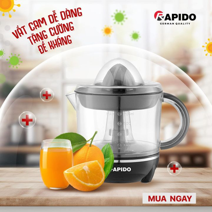 Máy Vắt Cam Rapido ROJ - 40 là một trong những máy vắt cam được ưa chuộng có chất liệu nhựa cao cấp, trong suốt giúp bạn dễ dàng quan sát lượng cam bên trong. Khay, ca và lưới lọc nước cam được làm từ các loại nhựa an toàn giúp an tâm pha chế. Bạn có thể dùng máy rửa chén để vệ sinh máy thuận tiện.