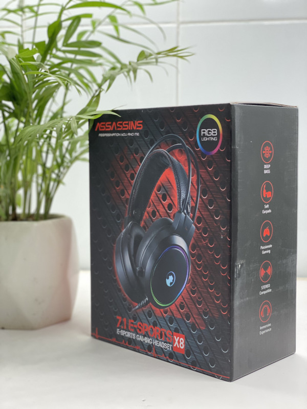 Tai nghe Gaming Assassins X8 7.1 LED RGB âm thanh giả lập 7.1 đáp ứng cho gamer chuyên nghiệp, mic đa hướng và khử nhiễu tốt.